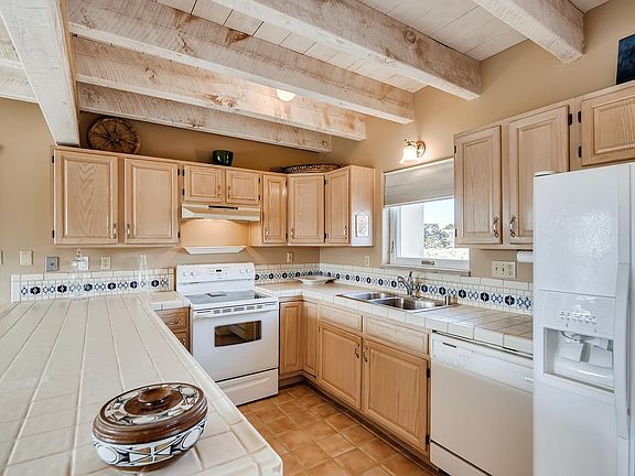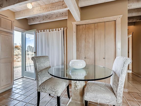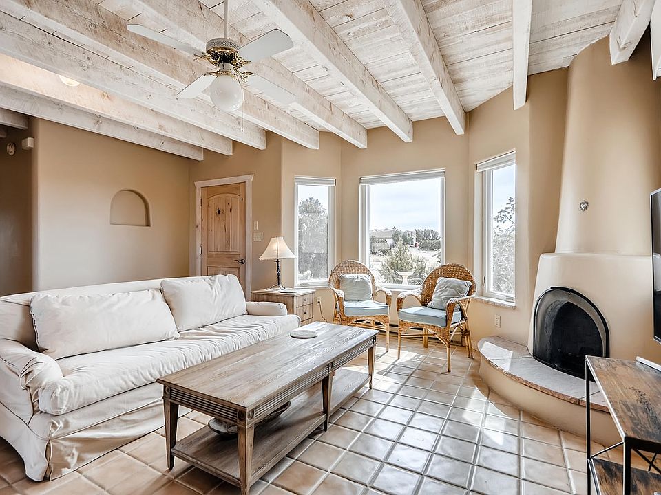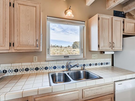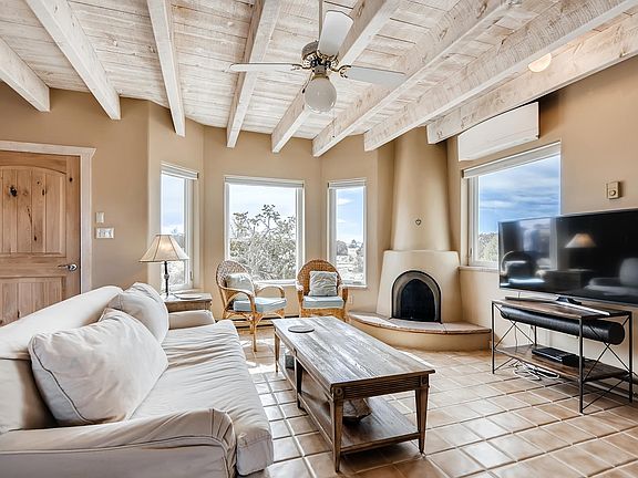 Looking for the perfect place that is quiet and inspirational for the birth of your first novel? A clean and charming home tucked up against open state land. Beautiful sunrise and sunset views. Sun filled adobe style home with open living space and kiva fireplace. Artisan touches through out the inside and outside of the property. Hiking out the front door! Fresh no VOC paint and materials chosen for chemically sensitive buyer. Artisan stone mason completed flag stone patios ~ mandala patterned back patio. Chiseled stone window sills and kiva fireplace stone bottom hearth. New multi~split air conditioning/heat units in living room and master bedroom. Double pane Marvin windows with fiberglass exterior and wood interior. New synthetic stucco completed 2018. Drywall replaced in two car garage with new steel reinforced garage door. Circular driveway lined with Chamisa and 11 year old drought resistant trees on drip system. Custom stone retaining wall and graveled back and front yards. Front bathroom updated. Hand finished American clay walls in bedroom.
