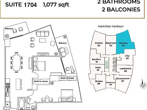 Marquee Residence Is One Of The Most Sought-After Luxury Condo Buildings In The Heart Of Downtown Hamilton A Modern, 5-Year-New Landmark And The Second-Tallest Building In The City. This 1077 sqft Spacious Two-Bedroom Corner Unit On The 17TH Floor Offers Two Oversized Balconies With North And East Views Overlooking The City And The Lake. A Sleek Kitchen Featuring A Central Island, Quartz Countertops, Backsplash, European-designed Custom Cabinetry And Stainless-Steel Appliances. Vinyl Flooring Throughout. Two Bright Bedrooms With Built-In Closet Organizers, And Large Windows That Fill The Home With Abundant Natural Light. In-Suite Laundry Included. Residents Enjoy Top-Notch Amenities, Including A Gym, Yoga Studio, Two Party Rooms,Complete With Kitchenette, Lounge Chairs, Fireplace And Billiards Table, And An 8th-Floor Outdoor Terrace Ideally Located Just One Block From Hess Village, Nations Supermarket, Samir Supermarket, Jackson Square, And The New McMaster Family Practice. HSR And GO Bus Stops Are Right At Your Doorstep. Close To McMaster Children's Hospital, St. Joseph's Healthcare Centre, And Hamilton General Hospital. No Smoking Building. Other Units With Various Sizes And Layouts Are Also Available, Offering Sweeping Views Of The Waterfront, Escarpment, And Downtown Skyline. Indoor Parking Available at Extra $150/Month. Available Immediately. Flexible Possession.