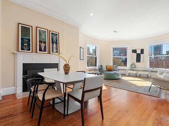 Live high above the prestigious Commonwealth Avenue Mall on the sunny side of the street in this boutique elevator building. The Back Bay views are spectacular from each of the eleven windows in this ultra rare, single floor, 3+ bedroom home. The fully open living / kitchen space has a backdrop of three majestic curved windows, tall ceilings and a gas fireplace. The kitchen is equipped with high-end appliances, gas cooking, white custom cabinets and a walk-in pantry. The separate den area offers flexibility for formal dining room, office space or a TV room warmed by gas fireplace. Each of the three bedrooms is spacious and has a view of the city skyline. The primary bedroom has a gas fireplace and en suite newly renovated expansive bath with a vessel tub, double vanity, glass shower enclosure with large single slab walls and heated marble floors. There is central air, direct access to a full parking space with EV charger, separate storage space and professional building management.