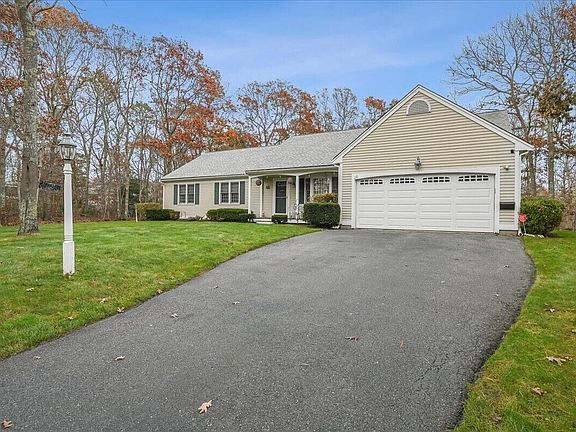 Holly Ridge with one floor living! This custom built ranch, on a quiet cul de sac, has over 1900 sq ft of living space. Entering through the front porch, in to the formal living room, the view out through the four season sunroom is lovely. It overlooks the private back yard, woods and the 3rd tee of the golf course. The home is spacious and light with vaulted ceilings and skylight in the kitchen and dining room. More family space or office space in the den with sliders. The main bedroom has a private bath with shower and two additional bedrooms and bath. Beautiful hardwood floors throughout. Quality describes this home with newer mechanics including Lochinvar boiler, Carrier central AC, and wired, ready for an automatic generator. Roof less than 10 years, Two car garage, irrigation, shed, full basement, natural gas heat, and recent new insulation after Mass Save energy audit. Close to Wakeby Lake, shopping, Mashpee Commons, Plus neighborhood Golf and clubhouse at Holly Ridge.