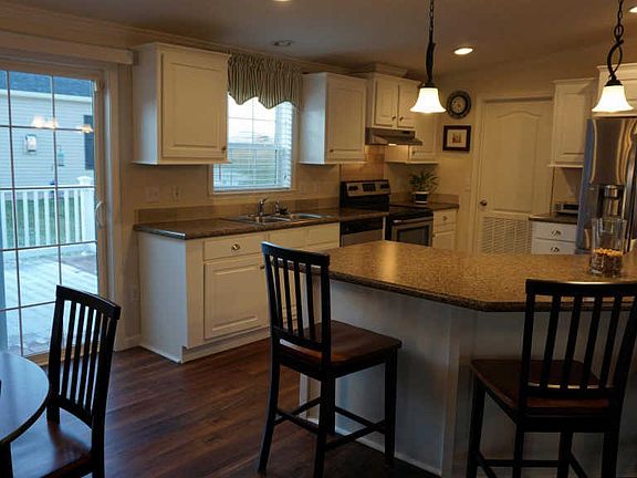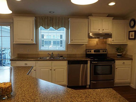 Gorgeous 3 yr old open floor plan Sage Model, 2 car garage, Stone on front peak, 3 Bedrooms 2 Baths, over $40,000 in upgrades. Custom Slate Gas fireplace, Laminate wood floors thru-out all rooms, Paddle fans T/O with lights, S/S Appliances with smooth top range. 12 x12 synthetic deck off kitchen sliders . Master suite with 60" one seat walk in shower. Laundry tub with pantry in large Utility room. Home office prewire. White Cabinets T/O with large curved island seats 6+. This one will not last long!! Lot lease includes Club House with Gym,Library,Game Room, Entertainment Rm with Kitchen, Heated outdoor in-ground pool with loads of activities, also includes Grass Cutting,Snow on streets and trash.