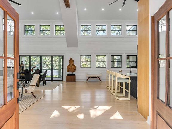 Sitting alongside the lake in the exclusive neighborhood of The Crescent, this custom-built home epitomizes luxury living with light-filled open living spaces oriented around the view of the lake, thoughtful finishes, and a spacious screened porch designed to enjoy the beautiful Lowcountry weather. Upon entering the home, you will be greeted by an open floor plan with the living room, dining area, and kitchen combined into one cohesive space. You will notice the grandeur of the space which is accentuated by 19' vaulted ceilings with exposed beams, abundant windows, and great connectivity to the outdoor living spaces through two sets of bifolding glass doors. The contemporary kitchen features modern custom cabinets, stainless appliances (including a Wolf range, Subzero refrigerator/freezerand Bosch dishwasher), and a large center island with seating. A cozy sitting room, located off of the kitchen, provides a more intimate place to gather and opens to the expansive screened porch. Also located on this main floor is the primary bedroom suite. The large bedroom has access to the outdoor living spaces, and lives large with a vaulted ceiling. A custom walk-in closet and an elegantly appointed en suite bathroom, with an extra large soaking tub, dual showers, steam showers, and dual vanities, complete the space. A lofted living area on the second floor is the perfect space for a home office or media room, while the home's remaining three bedroom suites are well-sized with en suite bathrooms complete with luxurious tile and finishes. Other finishes include reclaimed wooden support beams throughout the home, 10" plank white oak hardwood floors, shiplap accents, dual tankless water heaters, and dual HVAC systems.
