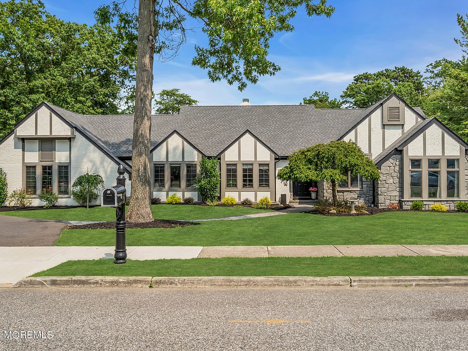 Stunning custom-built Tudor-style ranch located in the desirable Georgetown section of town. This home, completely renovated in 2022, boasts a solid brick & stone exterior sits on a spacious double lot. As you step inside, you're greeted by an open concept living area featuring a beautiful double-sided fireplace, perfect for cold winter nights. The entertainer's dream kitchen offers abundant storage, a double oven, & a 10-ft island with exquisite gold finishes. The home includes 4 bedrooms, 2.5 baths & generous closet space throughout. The master suite is a true retreat with a large walk-in closet, a separate vanity area & sliding glass doors that lead to a private balcony overlooking the expansive backyard. Custom windows flood the home with warm natural light, adding to its curb appeal.