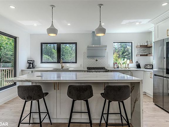 ELEGANT ESTATE ON 1.31 ACRES WITH PREMIUM FINISHES, EXCEPTIONAL OUTDOOR SPACE & MULTI-GEN POTENTIAL! Tucked away on a private estate lot just minutes to Barrie and Hwy 400, this jaw-dropping executive residence offers nearly 3,100 finished sq ft of completely reimagined designer living with showhome-worthy finishes and an exceptional lifestyle. A striking double-tower facade makes a bold first impression before stepping into sun-drenched interiors styled with oversized black-framed windows, pot lights, easy-care flooring and a neutral colour palette. The dream quartz kitchen is as functional as it is beautiful, featuring a waterfall island, stainless steel appliances including a gas stove, pot filler, modern hardware, open shelving and sleek pendant lighting, flowing into a sophisticated dining room with a walkout alongside a stunning living room with a linear fireplace, built-ins and a walkout. Six bedrooms and five bathrooms cater to large or multi-generational family living, highlighted by a magazine-worthy primary retreat with a five-piece ensuite with vessel sinks, walk-in closet, wood stove and private walkout. The finished lower level showcases an expansive recreation area ready for a pool table, a wood-burning fireplace for cozy ambience and a showstopping custom wine room that will thrill collectors and entertainers. Everyday living is elevated with a mudroom showcasing cabinetry and bench seating, a main floor laundry room and a dedicated pet wash station. Outside, enjoy resort-style entertaining with a massive deck, covered porch, hot tub, above-ground pool and sprawling lawn surrounded by mature trees for ultimate privacy. Whether it is sipping vintages in your incredible wine room or unwinding in the hot tub after a summer swim, this #HomeToStay captures the true joy of living well.