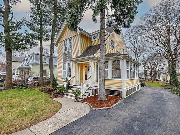 C.1886 Victorian where Charm Abounds! From the intricately detailed craftsmanship exterior to the interior beauty of stained glass,ornate fireplace, custom wainscotting and trompe l'oeil arched doorways.this is a Gem. The first floor boasts a living room with coffered ceilings, ornate fireplace, built-in bookcases and French doors open to a sunlit study/office. The dining room features a triple bank of stained glass windows with custom plantation shutters.The family room is hi-lighted with a unique wainscotted ceiling opens to deck overlooking expansive yard. The updated kitchen features granite island, panelled dishwasher, & 5 burner stove. Pre-wired speakers too! The second level has 3 bedrooms, HW floors, recessed lighting, full bath with tub & dual shower system.The bonus is on the 3rd level. A haven for your escape: Music Studio, Art Studio, Au pair or potential master suite! Just steps to shops, restaurants, recreation, and Commuter Rail to downtown. Offer deadline 12/14 at 6PM