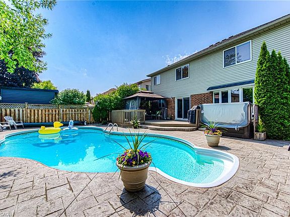 YOUR PRIVATE SUMMER PARADISE IN NORTH GALT! 20 Holbrook Crescent, Cambridge. Welcome to the kind of home that makes summer feel endless! Tucked away on a quiet crescent in North Galt, just minutes from schools, bike trails, places of worship, and the 401—this 4-bedroom, 2.5-bath home is the perfect place to put down roots and soak up the good life. Step inside to a sun-drenched foyer and a soaring vaulted ceiling in the living room. The open layout flows effortlessly with a formal dining room, home office or den, and a cozy family room with a gas fireplace and oversized bay window looking out to your own private oasis. The heart of the home is the kitchen, complete with granite countertops, tile backsplash, and a walk-in pantry—opening onto a bright breakfast area with oversized sliding doors leading straight to backyard bliss. Fire up the BBQ with a built-in natural gas line, dine under the gazebo, take a dip in the lagoon-shaped heated chlorine pool, or unwind in the hot tub while music floats from the poolside cabana—fully equipped with electrical and Bose speakers. Upstairs, the oversized primary suite stretches across the back of the home, offering a peaceful escape with a walk-in closet and spa-like ensuite featuring a soaker tub and separate shower. 3 more generous bedrooms and a 4pc bathroom complete the second floor. The basement is ready for your imagination, with a 3-piece rough-in already in place—just waiting to become the rec room, home gym, or teen retreat of your dreams. Notable updates include new carpet upstairs & powder room vanity (2024), A/C (2014), pool liner and heater (2017), hot water heater (2014), main floor laundry, vinyl windows, water softener (2012), roof (2012), and more. Whether it’s pool parties, quiet morning coffees under the trees, or quick school runs and highway access, this home truly checks all the boxes.
