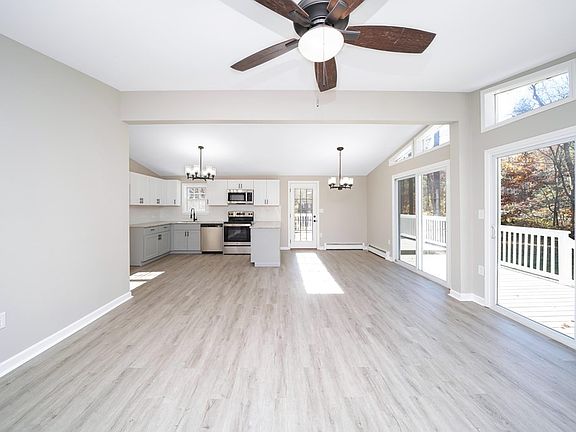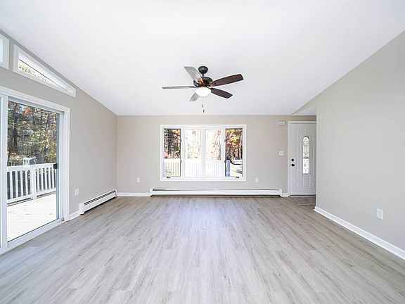 Are you looking for one floor living with updates throughout? Look no further! This three bedroom, two bathroom Ranch has everything you need and more! Walk inside and find an open concept living room that flows into your kitchen area. Two sliding glass doors open up to your wrap around deck that is perfect for entertaining. Down the hall find three bedrooms all with brand new carpet and fresh paint. The main bathroom has tiled flooring, tiled shower, and its own linen closet. The main bedroom features its own bathroom with tiled shower and a brand new vanity. In the basement you'll find a large fully finished area as well as a brand new boiler and oil tank. The exterior features over 2 acres of land with wooded area between neighboring houses. Enjoy all this house has to offer! Call to schedule an appointment today.