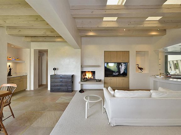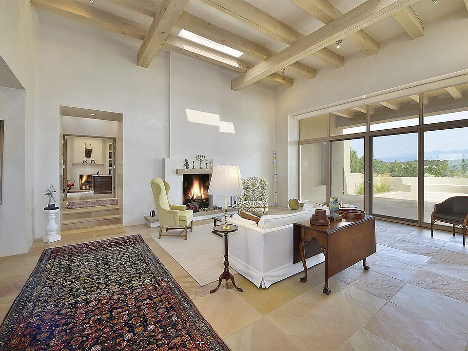 Located in the desirable community of Las Campanas, this spacious 4 bedroom 5 bath hilltop home designed by Rad Acton and built by Kim Dressell seamlessly blends southwestern and contemporary styles. The open layout, soaring ceilings, and sliding glass doors that open to a flagstone portico make this home perfect for entertaining. The chef's kitchen features granite countertops, a Wolf gas range, Miele steam oven, Sub-Zero refrigerator, a built-in desk and more. The wet bar, next to the kitchen, is equipped with a wine refrigerator and ice-maker. There are 3 ensuite bedrooms including the master suite which boasts a roomy walk-in closet, steam shower, jetted tub and dual WCs. The 600 sq. ft. fourth bedroom has its own exterior entrance and could be used as a studio. Special interior features include 5 gas Aqua Glass fireplaces, remote controlled window shades, built-in LED lighting, art nichos, central A/C and radiant heat. Outdoor features abound with a rose garden, 2 enclosed grassy areas perfect for pets, and 2 portals. Enjoy the 48-foot heated double lane lap pool with electric cover and attached spa. The property has an electric gate, a private gated front courtyard, and off-street parking. Stately design, high end finishes, plus spectacular 360-degree views of the Sangre de Christo and Jemez Mountains as well as Sandia Peak. Easy access to all the cultural, culinary, and recreational amenities of Santa Fe.
