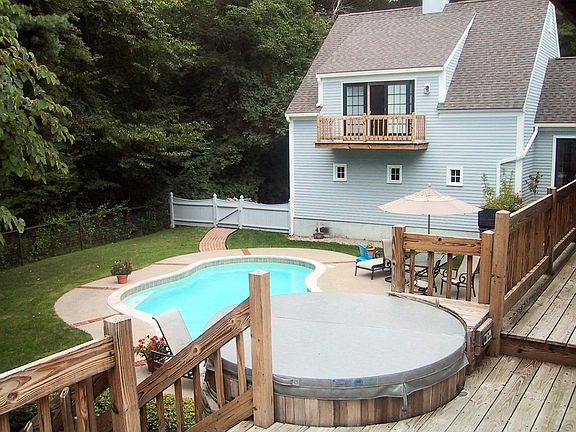 Warm and welcoming Colonial in one of Norwell's most desirable cul-de-sac setting abutting acres of conservation land and walking trails in historic Norwell Village. This home has a formal dining room with an impressive mural which adds timeless beauty. The kitchen has an authentic brick fireplace, new lighting and glistening hardwood floors. Stepping down to the family room we find an open floor plan with built in bookcases, marble fireplace and french doors that open out to a balcony that overlooks the pool area ,great for entertaining. Off the family room we find a relaxing sun room that with over sized windows so you can enjoy all that nature offers. Upstairs to master suite where we find a wonderful marble fireplace, your own private balcony and master bath.