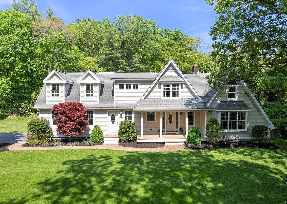 Spectacular contemporary cape in a gorgeous natural setting on 1.48 level acres. The sunny open floor plan features a large living room and gathering space with a dramatic two-sided wood burning fireplace and custom built-ins. Kitchen with cherry cabinets and granite countertops and small mudroom entry makes for easy access from the two-car attached garage. There is a terrific family room or office with custom built-ins which overlook the deck and fabulous backyard with an inground pool and professional landscape. Large primary suite with a beautiful updated bathroom with soaking tub and shower plus a big walk-in closet. Laundry room with a window! Savvy buyers will see the terrific value and opportunity with all expensive updates done– new well pump system, brand new septic, high efficiency hot water heater. All you have to do is move in and enjoy! Come see! You will love coming home!