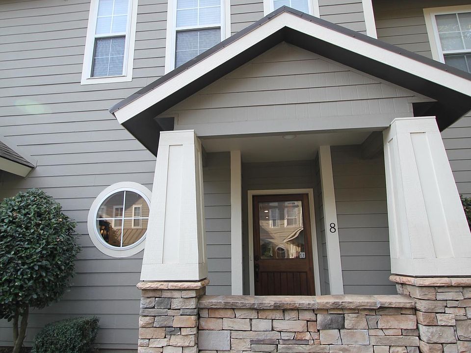 Upstairs you will find 2 bedrooms, each with their own full bath. Both bedrooms feature vaulted ceilings and large closets. The master bath features a soaking tub, a separate shower, and double sinks. There is a large hallway storage/linen closet upstairs and a separate closet that holds a washer and dryer that are included in the lease.