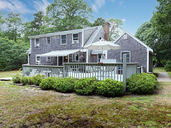 This is a pristine 3+ bedroom Cape home at the very end of a quiet cul-de-sac on the Bay side of Eastham. You can enter the home from the garage or the farmers' porch, into a mud/laundry room, off the kitchen. The first floor living space has a wood-burning fireplace, vaulted and beamed ceilings, and a skylight. The kitchen/dining area has sliders to the back deck. Also on the first floor are 2 good-sized bedrooms. Upstairs is the larger primary bedroom and another space that can be used as an office or TV room. Outdoors, we have the obligatory outdoor shower, a huge back deck and an awning for a break from the sun. You can see pride of ownership throughout this home, including the wonderful landscaping. Home being sold fully furnished with just a few exclusions. Dream Here!