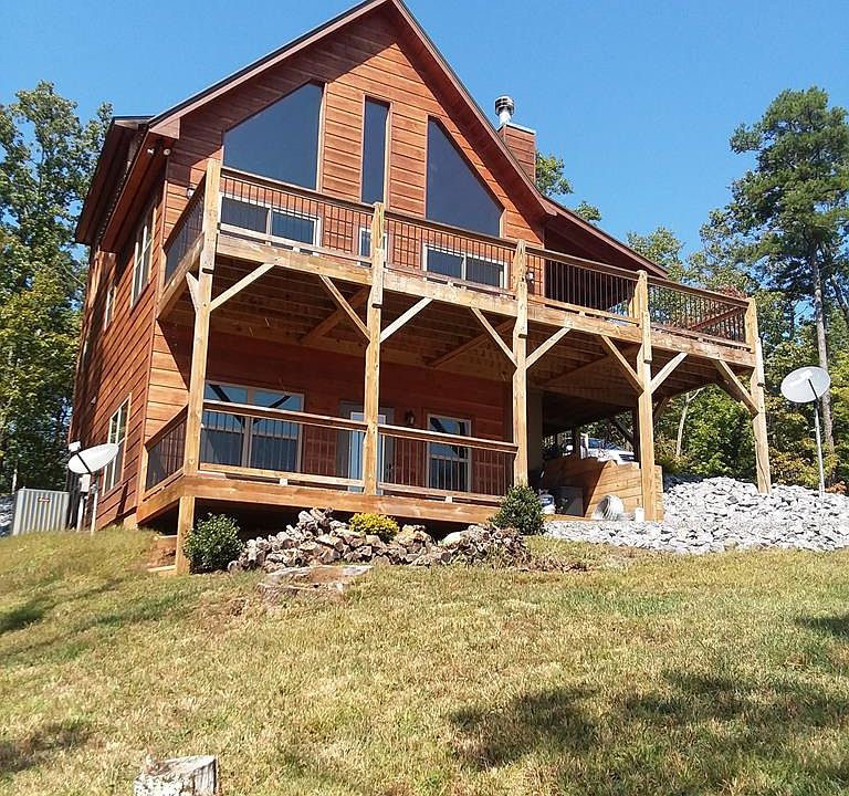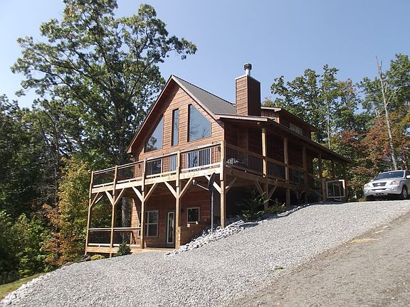 Chalet style cabin with long range mountain views and all the extras! Only two years old with stone woodburning fireplace, hardwood floors throughout, tongue-in-groove ceilings and walls, metal roof, granite countertops, hickory cabinetry, stainless steel appliances including washer & dryer. Custom accents - copper kitchen sink, rustic bark entry door accents, rustic bark on kitchen island face, custom bathroom vanities, dual zoned hi-efficiency HVAC. Unfinished basement. Property is open with fenced area for pets. Quiet, gated community, common area pavillion, walking paths for residents and their guests. FURNISHED! (except for upper bedroom TV & basement items)