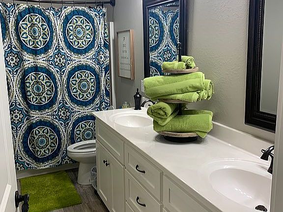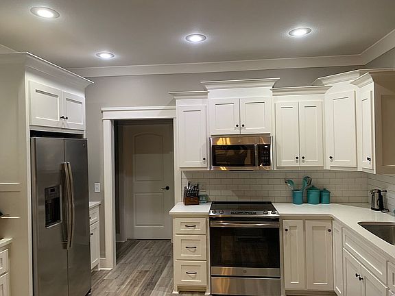 Tucked in the trees this beautiful custom home sits on 1.31 Acres. 4 bedroom, 2 bath home includes, white cabinets throughout, gray scheme paint, luxury vinyl flooring throughout, with carpet in bedrooms. Split floor plan, master with soaker tub, custom tiled shower with rain shower, and his and her closets! Guest bedrooms are all large, walk-in closets in 2 of the 3 guest bedrooms. Sunroom that is heated and cooled. Sunroom is part of square footage. Wood privacy fence Call for your private showing today!!