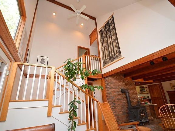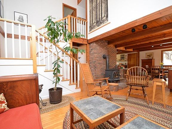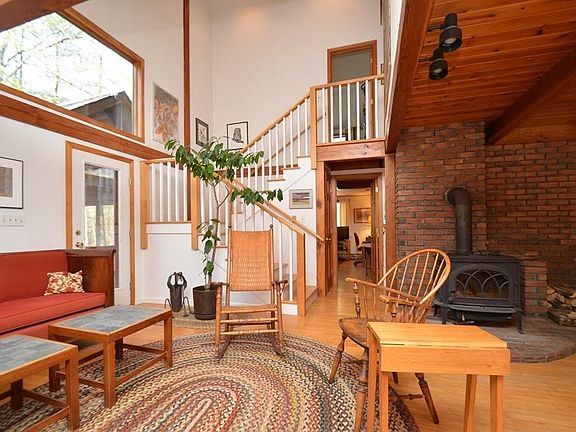 Live well in this charming American Barn designed contemporary. Enjoy the deck on the front of the house that leads to an air lock foyer. Cozy up to the wood stove and sit for awhile! Open Floor Plan with living/dining/kitchen with open concept. Spacious bedroom and full bath can be found on first floor as well as mud room with laundry. Upstairs there are two large bedrooms and a lovely home office. Beautiful maple flooring, cathedral ceilings, custom staircase all add to the ambiance of the home. In the warmer months enjoy the large screened porch and listen to the night. Wooded setting for privacy. Oversized two car garage and metal roof are a plus! Literally an easy 10 minute ride to UMASS. Years of landscaping with perennials. Enjoy Country living without losing the conveniences.
