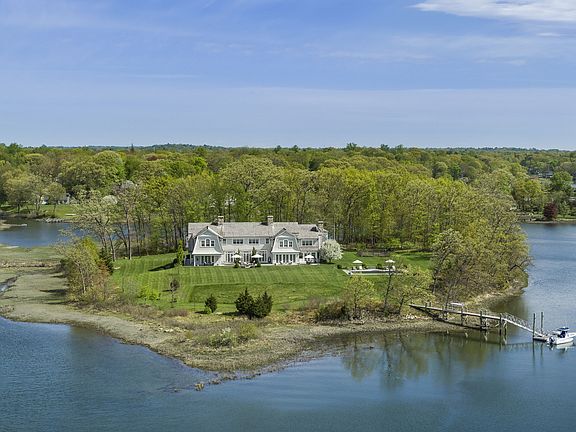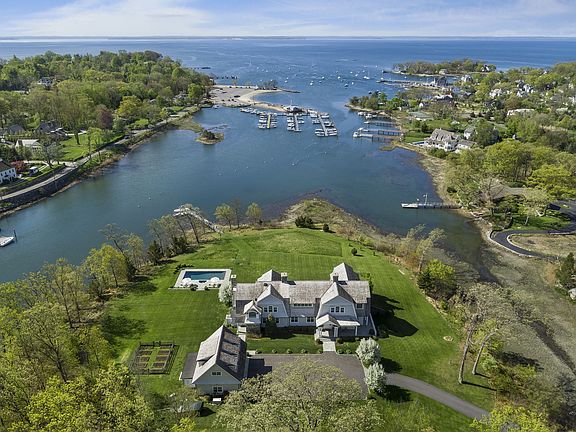 Come by Land or by Sea! Located directly on Long Island Sound, this 7.1 acre estate is one of the largest waterfront properties in Darien. The dock provides full access to the Sound and beyond and has additional storage for kayaks and paddleboards. The 9,100 sq. ft. home has a great room with 12' ceilings and 2 limestone fireplaces, gourmet kitchen w/ breakfast room, family room w/ stone fireplace. It has 10 sets of french doors to expansive flagstone terrace. 5 en-suite bedrooms w/ water views, 8 bathrooms, full w/o basement w/ billiard room, astroturf sports court, workshop. Gardens, pool and outdoor shower. Newly staged by award winning design firm LTW Design -- Hobi Award Winner 2018.