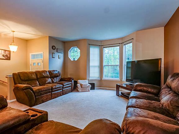 Wooded location into lovely subdivision of Townsende. This is the 3 BR Eton model in move in condition . Open floor plan with two fireplaces. There are 9ft ceilings large bedrooms. There is a two sided fireplace between the living and dining rooms. Eat in kitchen with 42" cabinets, upgraded tile flooring and lighting, self cleaning gas oven. The basement is finished and the home offers a two car garage. The townhouse faces the woods which offers privacy. This is a great place to live and close to shopping and buses to NYC along with a quick commute to major highways. Home warranty included.