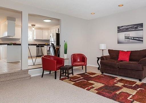Spacious town house style condo featuring an open floor plan!! Large updated eat-in kitchen with lots of cabinet space, stainless steel appliances and a new tile floor. From the Kitchen step down into the Living Room that has plush new wall to wall carpeting and a slider that steps onto the private deck overlooking the wooded backyard. Upstairs are two large bedrooms with ample closet space. Both bathrooms have been updated. This sweet condo offers room to expand in the basement, convenient in unit laundry, expansive closets, and a private end-unit location. Pet friendly!