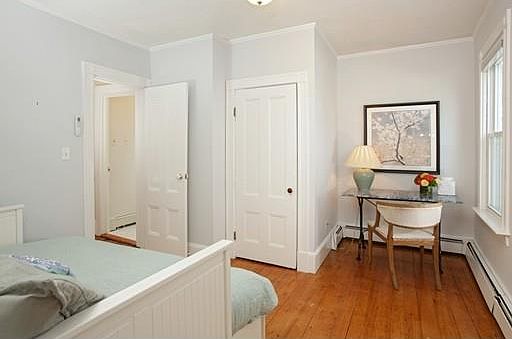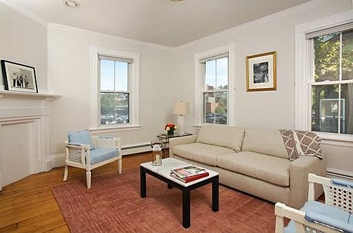 Located in the heart of town center on a gas lit street, this 2BR/2BA duplex offers 1155 square feet of light filled living space. Beautiful double parlor with pocket doors offers a living room with corner exposure, custom built-in, decorative mantel and an elegant dining room with pine floors and crown molding throughout. Tucked off the dining room is a large kitchen featuring white cabinetry, granite countertops, a gas range, white subway tile backsplash and peninsula with bar seating. Charming main floor bedroom with wonderful natural light, pine floors and adjacent full bathroom featuring a marble floor and Carrara topped white vanity. The large master bedroom offers custom built-in storage, three closets and an en suite full bathroom. Amenities include: air conditioning, in-unit W/D, deeded storage and a stunning roof deck with views of the Bunker Hill Monument, Zakim bridge and Boston skyline. Wonderful access to Charlestown's shops, restaurants and MBTA.