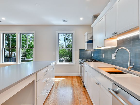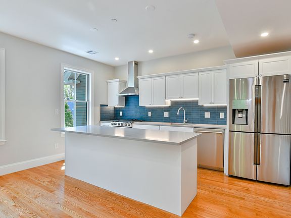 Sophisticated custom designed unit, completed in 2020 and situated in the heart of Jamaica Plain. The architect and interior designer worked in tandem with the owner to create a unique space worthy of the quarter acre oasis. Overlook the garden from your deck and feel grateful that you live in such tranquility. The 1,600 sq. ft unit is on 2 levels featuring 3 bedrooms and 2.5 bathrooms. Hardwood floors throughout, high ceilings, central air and filled with natural light, it has all the amenities you'd expect from a high-end dwelling. The open concept on the main floor is on the second level offering a kitchen / living room with a professional grade range, hardwood cabinets, breakfast bar, Caesarstone countertops, and a spectacular blue encaustic cement tile back and half bathroom with laundry are off the light filled living room. The third floor consists of three bedrooms and two full bedrooms, one master bedroom, separate two bedrooms and bathrooms and direct access deeded parking. MUST SEE! AVAILBLE MAY 1, 2025. No Smoking allowed on the premises. 12 months lease