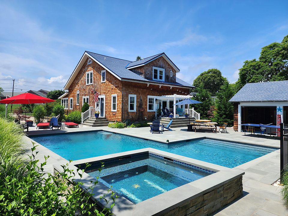 Rental Registration #: SU230038 Salt Water Gunite Pool and hot tub and a 3000+Sf WHB Beach Village home sit on a secluded 1-acre lot. Walk and bike to town, train and beaches! Enjoy original 1929 charm with modern amenities: Completely Ronavetaed 2020. New Gunite salt-water pool and 12 person hot tub with waterfall. Hardwood flooring, 55 large (new) windows with plentiful natural light. spacious Living Room, Formal Dining Room, Breakfast Nook, Large Modern Eat-in Gourmet Kitchen/Living Area with Back Porch leading to Bluestone Pool Patio. MaIN floor has two separate sitting areas (for some quiet, alone time), in addition to the First-Floor Guest Room with Queen Bed). Upstairs has Five Bedrooms (including Two En Suites with King Beds & Private Baths; Two Bedrooms with Two Twin Size Beds, One Bedroom with Queen Bed) plus Full Hallway Bathroom with double-sinks. There is also a ground-level bonus room with a full washer/dryer. Located in the Village of Westhampton Beach, this charming, eco-friendly, 6 bedroom /4 bathroom, 2-story cedar shingle Hamptons home is perfect for your stay!The pool has a built-in lap-lane, among other luxury details. Large outdoor bluestone patio with a large grill and outdoor fireplace. Full bath with Steam shower located off the pool area.Smart TVs and Sonos speakers. Adt and Ring security system with keypad entrance.The house is located on a quiet road, across the street from Westhampton Beach Schools with a full track, tennis courts, basketball courts, and baseball fields available to use. This 1-acre property has a full front and back yard and a wooded section with a small mountain bike trail.In the evening, you can hear the OCEAN roaring from 1.5 miles away. Enjoy making your way to the fresh, ocean air, by an easy walk or jog, or expeditious bike ride, or an efficient car ride. Never a dull moment, in what we call, the "Plantation." Enjoy local shops and restaurants, or enjoy a grilling gourmet at home. Explore the beaches throughout Westhampton Beach. Beach passes are available for Rogers Beach less than 2 miles from home