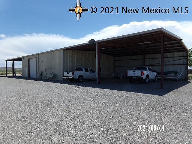 Barndominium! Here is a unique home with endless possibilities. Located smack-dab between Artesia and Carlsbad with a view of the lake. The 1551 sf (+/-) of living area consists of a large efficiency apartment with a separate living room, and a up-stairs loft with a bedroom/office. The shop area is 1000 sf (+/-) with a roll up garage door and steel shelving. This shop and living area is book-ended by two massive covered parking areas, both 40'x40'. The west side is walled, and the roof is high enough for the biggest RV. The South bay features water connections, septic connections and 50 Amp electric service. All located on 6 acres (+/-).