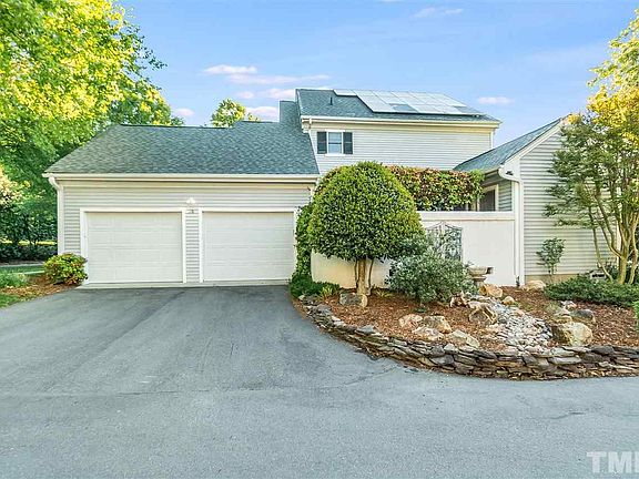 Walk to Camden park, pool or the spa, dining and shops of Fearrington Village - yet location provides privacy and serenity. ~$100k of upgrades include solar panels, updated master bath, hardwood floors, carpet, light fixtures and more. Kitchen features granite counters, butcher block island and a breakfast nook that could double as an office. Formal dining leads to living room with fireplace and vaulted ceilings. Enclosed courtyard shaded by beautiful trellis provides tranquility. 2 bedrooms upstairs.