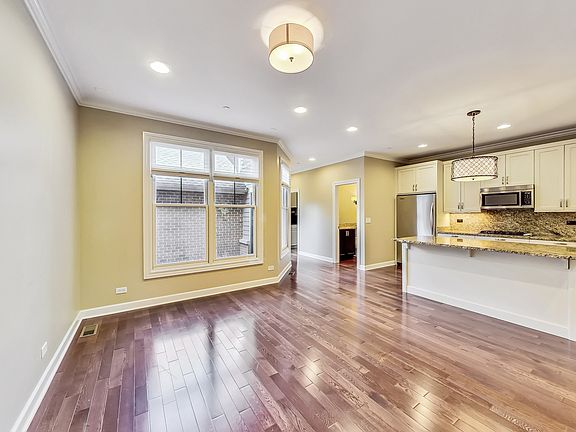 Discover this beautifully upgraded townhome in the heart of Uptown! Featuring hardwood floors and custom window treatments with elegant crown molding throughout. The open-concept living and dining areas are ideal for entertaining, while the kitchen boasts white cabinetry, stainless steel appliances, and granite countertops. Relax by the fireplace in the inviting family room. The first floor offers convenient amenities including a laundry room and a half bath. The primary suite is a true retreat with a luxurious master bath, walk-in closet, and an adjoining office or sitting room. The fully finished basement with 9 ft. ceilings provides ample storage and is pre-plumbed for an additional bath. Enjoy a private patio and the convenience of a two-car attached garage. Live in the best of Uptown, just steps from Trader Joe's, Metra, restaurants, and more!