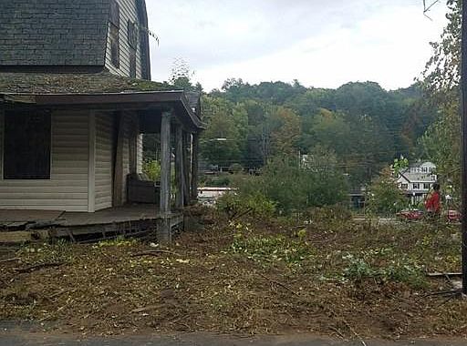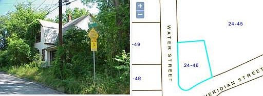Lot and building on corner of Meridian St and Water St. Lot was recently cleared but home has not been inhabited for years.