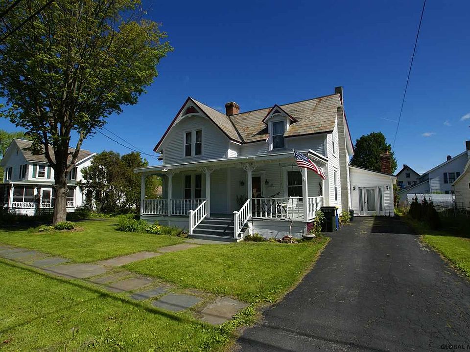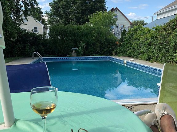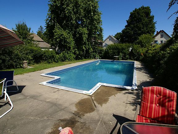 Nice 3 bed room village home with yard space and gorgeous in ground pool! Featuring extra spacious family room with vaulted ceilings and stone hearth w/wood stove along with slider to big patio and pool, living room, formal, big kitchen, laundry and one 1/2 baths down, 3 bed rooms and second full bath up, new boiler-fuel tank & pool liner, mature fruit trees, hardwood flooring and trim throughout home, lots of storage, two paved drives, walk to all location close to little league rec park.