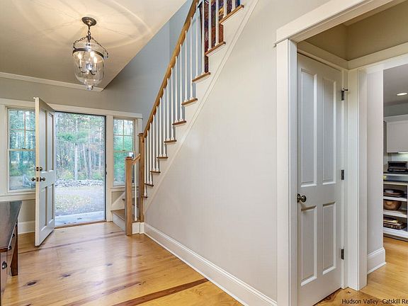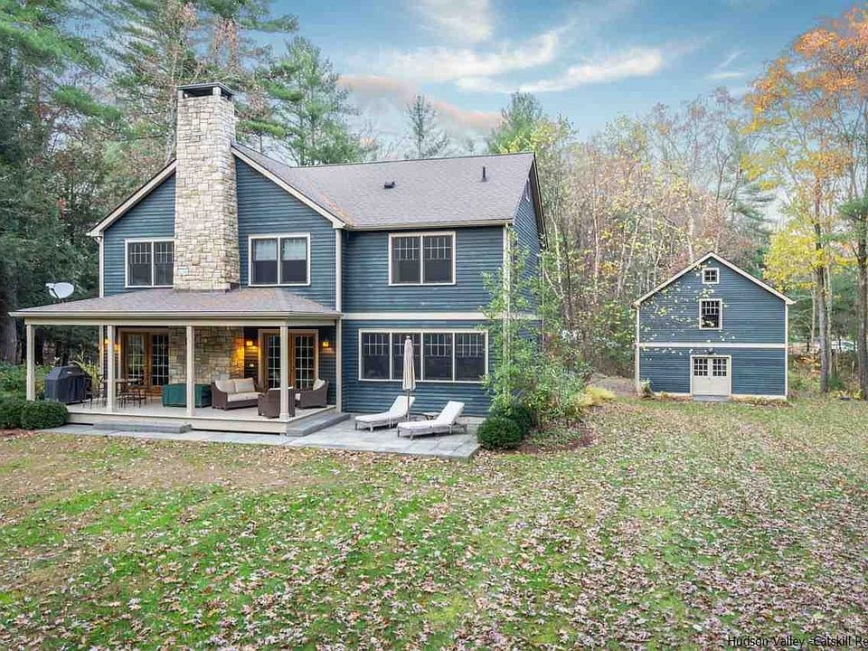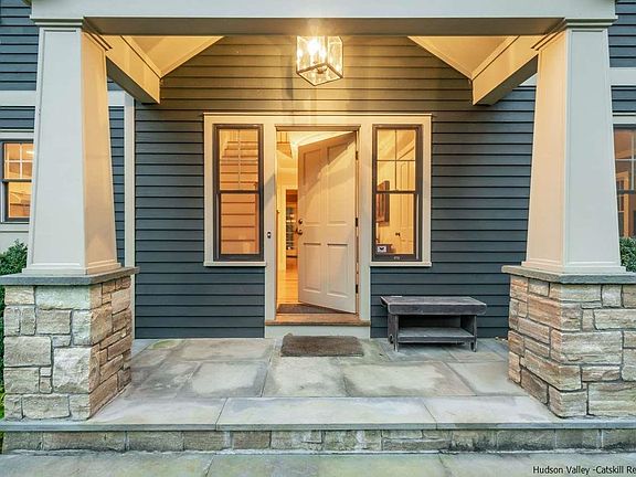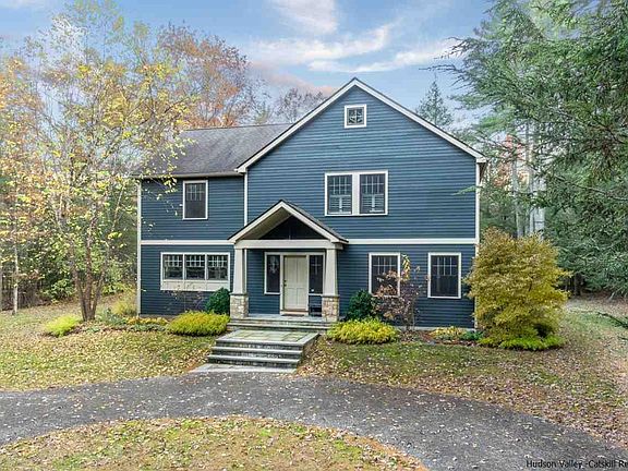 Large rooms and clean design await you at this sophisticated contemporary farmhouse that's privately sited in an area of other fine and interesting homes. The crisp, white cook's kitchen opens to the dining room and features Jenn Air appliances, honed black granite countertops, custom cabinetry, plenty of work space to accommodate multiple cooks and as much storage as anyone could want. An abundance of natural light pours in to the generously sized living room, which has an impressive stone fireplace and two sets of French doors to the covered rear porch. A den and powder room complete the first level of the home. Upstairs, the master suite is an oasis of calm, with plenty of storage, a window seat, and a limestone bath with two sinks, soaking tub and stall shower. Three additional bedrooms share another bathroom with double sinks. Full basement and detached two-car garage offer plenty of storage space as well as options for future expansion. There's a stone patio off of the rear porch and plenty of room for a pool. The property is landscaped and fenced, and systems have been meticulously maintained. Nearby attractions include Westwind Orchard, Arrowwood Brewery, Minnewaska State Park, Mohonk Preserve, Woodstock, Stone Ridge, High Falls and New Paltz, in addition to many farm stands, restaurants and local shops.