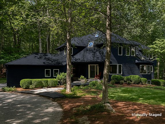 Architect-designed Bridgewater oasis set next to over 300 acres of Roxbury Land Trust. Tucked away on 4+ private acres, this light-filled contemporary by Stephen Lasar was designed with passive solar principles, offering a retreat with exceptional privacy and efficiency. With 2,500+ sq ft, the home features 4 bedrooms and 3.5 baths, including a first-floor suite and a dedicated office. Upstairs, you'll find 3 bedrooms, including the vaulted-ceiling primary which overlooks treetops and is complemented by a convenient second-floor laundry. Artistic hardscaping leads to a covered porch and active stream feature, connecting the home to its natural surroundings. At its heart is a well-appointed kitchen and stone fireplace living room that flows into the dining area, framed by windows showcasing fern-covered grounds and dramatic granite outcroppings. The finished walkout lower level includes a full bath, media room, workshop, and storage. Outdoor living shines with a composite deck and stone patios. An attached two-car garage offers storage or workshop space, while a separate barn provides room for hobbies or equipment. Just minutes to Bridgewater village and a short drive to New Milford, Roxbury, Washington, and Lake Lillinonah, this property blends architectural integrity, natural beauty, and convenience-offering tranquility without isolation.