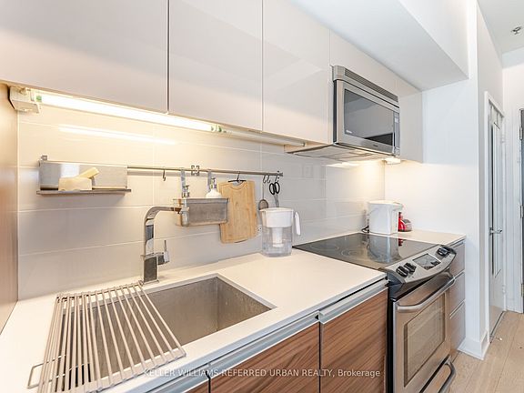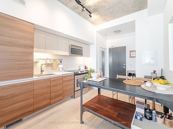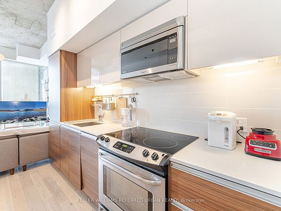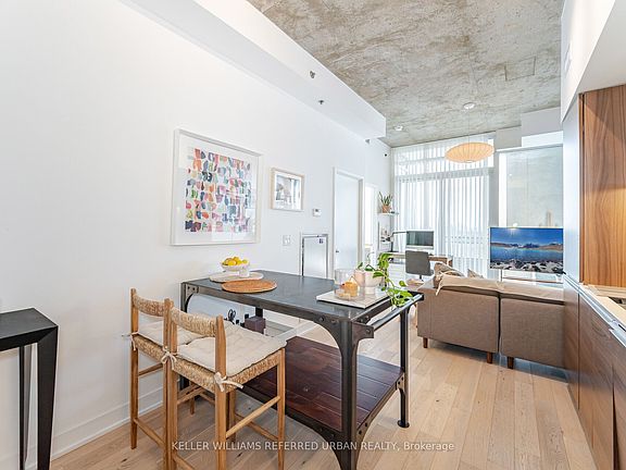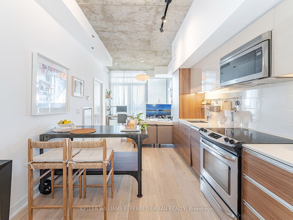 Welcome to Suite 1108 at The Carnaby in Queen West- a beautifully upgraded, owner-occupied 1 bedroom 1 bath condo featuring 10' exposed concrete ceilings and unobstructed west-facing views. Located on the 11th floor of the South Tower, this unique suite offers exclusive access to both South and North Tower elevators, available only on the amenity and 11th floors.This designer unit includes over $10k in recent upgrades: new fridge, modern bathroom with premium plumbing fixtures and frameless glass, custom designer window coverings, balcony deck tiles, and high-quality custom closet built-ins for exceptional storage. The open-concept layout features hardwood floors, full-height windows, and a bright bedroom that comfortably fits a king size bed.Residents enjoy top-tier building amenities, including a fully equipped gym, party room, rooftop terraces with BBQs, and 24/7 concierge. Located in the heart of Queen West, enjoy access to Metro, Dollarama and Starbucks from inside the building, steps to shops, cafés, restaurants, transit, and everything this vibrant neighbourhood offers.Perfect for first-time buyers, investors, or anyone seeking a modern, move-in-ready condo in one of Toronto's most desirable communities.