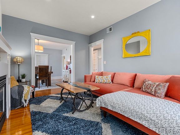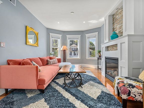 On a corner lot with beautiful light exposures, this thoughtfully updated top-floor two-bedroom offers great convenience and retains abundance of original character details. The well-proportioned living and dining rooms are enhanced by wide window bays and a gas fireplace with a handsomely finished custom mantel.The renovated kitchen features stainless steel appliances, granite countertops and great storage, and the renovated tiled bath has a tub/shower combination. There is a corner bedroom with two closets and another with a wide window bay and walk-in closet. The property boasts modern conveniences like recessed lighting, in-unit laundry and central air conditioning. Private front and rear porches, a sweet common yard and a large private basement storage room round out this special offering. Just one block to the commuter rail at Bellevue Station, location offers easy access to the shops restaurants of nearby Centre St and vibrant Roslindale Village. A truly lovely spot to call home