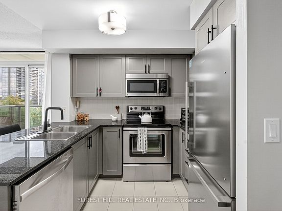 This spacious corner unit 2-bedroom condo features a stylish open-concept layout with a private balcony. The modern kitchen is equipped with granite countertops and stainless steel appliances, flowing seamlessly into the bright living and dining areas. The primary bedroom includes a walk-in closet and direct access to a sleek four-piece bathroom, while the second bedroom offers generous closet space and a quiet retreat. A second four-piece bathroom is conveniently located in the hallway. Additional highlights include a front-loading Whirlpool washer and dryer, and a large front hall closet for extra storage. Located in a well-maintained building with amazing amenities, and just a short walk to Promenade Mall, public transit, top-rated dining, and some of the best shopping and services in prime Thornhill.