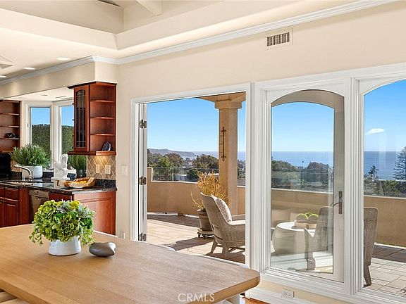Discover coastal luxury and captivating panoramic ocean views in this stunning custom residence nestled in Three Arch Bay, one of SoCal’s most desirable private enclaves. Crafted with attention to detail and design, this highly-upgraded home is elevated with modern amenities and embodies sophistication, comfort and style. At nearly 3,550 sf, this 4-bedroom (3 en suite), 5-bath home includes an office, separate family room, elevator (connecting all 3 levels), A/C, 2 gas fireplaces, and direct access garage. Dramatic ocean-close views from every level seamlessly blend indoor/outdoor spaces with multiple decks and terraces for the ultimate coastal lifestyle. The main level entertaining space is open, airy and inviting, with its soaring beamed ceiling and elegant fireplace. French doors open to the expansive deck capturing views from Dana Point Headlands to Catalina and beyond, with evenings bathed in the glow of breathtaking sunsets. The gourmet kitchen is a chef’s dream, complete with a spacious center island, high-end appliances, double ovens, dual sinks, and a wine cooler in the walk-in pantry. This level also includes a large private office or flexible as a guest or game room. On the second level, find 4 well-appointed freshly carpeted bedrooms (with outdoor access) plus a spacious laundry room. The master suite is a private retreat with its own deck, sumptuous soaking tub and separate shower with water views, dual vanities, and a sprawling walk-in closet with custom built-ins. Descend to the third level which features an oversized family room with a cozy fireplace, wet bar, and opens to an expansive outdoor haven with more ocean views. The extensive backyard is perfect for hosting special celebrations or intimate gatherings with lushly landscaped tiered gardens for year-round enjoyment of Laguna Beach’s idyllic climate and starlit evenings. A multi-purpose workshop/studio/storage room has a secure, separate entry. Located in the exclusive, guard-gated community of Three Arch Bay, residents enjoy private beach access, numerous HOA amenities, and a lively calendar of community and holiday events. Don’t miss the opportunity to call this coastal sanctuary your next home!