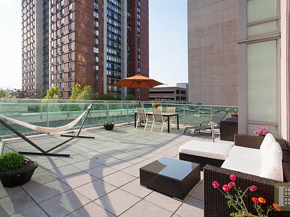 Enjoy fabulous space and streaming sunlight in this luxurious 1420 square foot three bedroom, two bathroom corner home that offers two private outdoor spaces including one massive 500 square foot terrace. This stunning home at Newport's acclaimed Shore South building features a dramatic living room with a corner of windows offering all-day southern light and western exposure providing wonderful sunsets. The open gourmet kitchen features a large island, walnut cabinetry, granite countertops and stainless steel Kitchen Aid appliances including a gas range. Other highlights include hardwood floors throughout, ample closet space including double walk-in master closets, a spacious master bathroom with a soaking tub and separate shower, an Asko washer/dryer, custom closets and a state-of-the-art integrated central heating and cooling system designed so the maintenance fee covers hot water and most heating/cooling costs. The Shore at Newport offers world-class amenities including a 24-hr concierge, fitness center, children's play room, conference room, rooftop Jacuzzi/sauna facilities and a spectacular private residents' lounge with a wrap-around outdoor terrace with amazing Hudson River and Manhattan skyline views. The Newport area offers many conveniences and amenities including a Morton Williams grocery store at the base of the Shore South and an open plaza that converts to an ice skating rink in the winter. Built in 2007, the Shore South is located just off the Hudson River waterfront only six minutes to the Newport PATH, 12 minutes to the Hoboken PATH/Ferry/Train terminal and two minutes to the brand new Newport Green Park that even includes a carousel and a 7500 square foot beach.