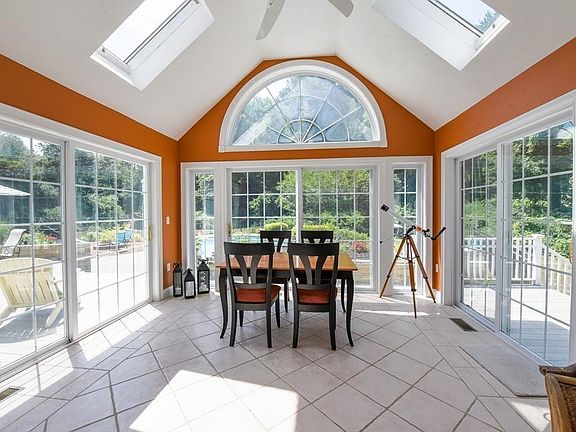 SPECTACULAR SETTING! 20 Nicole Ln is an exceptional property that combines traditional features with the love of nature. First floor flows nicely:spacious EIK with breakfast bar, tile flooring and granite counters, DR and LR with HW flooring and custom molding ,FR with stone FP, cathedral ceiling and french doors to 4 season room with floor to ceiling views of pool and deck access. ½ bath and private home office completes 1st floor. 2 story foyer leads to 4BR's, 2FB and designated laundry room! MBR suite with cathedral ceiling, sitting area,WIC and MB with jacuzzi tub, double vanity and step in shower.Exterior green space is stunning: heated mountain lake shaped pool with beautiful hardscaping and decking ,mature plantings and open level green space abutting conservation.3 car garage, walk up attic and unfinished basement perfect storage or future finished space. 20 Nicole Lane a wonderful place to call home, located near major commuting routes and close proximity to downtown Groton.