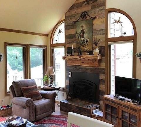 This END UNIT OAK GLEN GOLF VILLA is located at the Eagle Ridge South Course (near clubhouse) and offers lots of light and short distance to vehicle in parking area. It has been updated by Master Craftsmen since 2018 with new wood ceiling beams, new ceiling fan in Master, new trim in Master bath, Shaw Sequoia Hickory hardwood flooring, Mannington Adura tile flooring, some fresh paint, plus the addition of an all new gas log fireplace with floor to ceiling horizontal multi-tone simulated Encor barnwood and Cedar mantle which combine to create a gorgeous focal point for the unit! Newer black & stainless steel kitchen appliances gleam in the galley. Several other innovative additions to the unit since 2018 maximize the use of space in this golf villa! Being owner occupied the furnishings are not included --only the appliances and window coverings are included. Furnace was replaced in 2019. These units are scheduled for new decks this season paid for by the Spring Creek Townhouse Association.