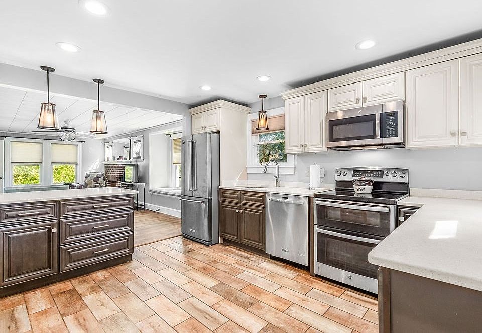 - Features: Flooring - Wood, Countertops - Stone/Granite/Solid, Countertops - Upgraded, Kitchen Island, Country Kitchen, Open Floorplan, Recessed Lighting, Remodeled, Lighting - Overhead