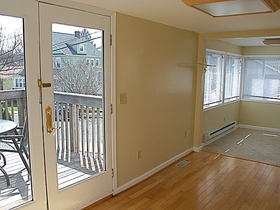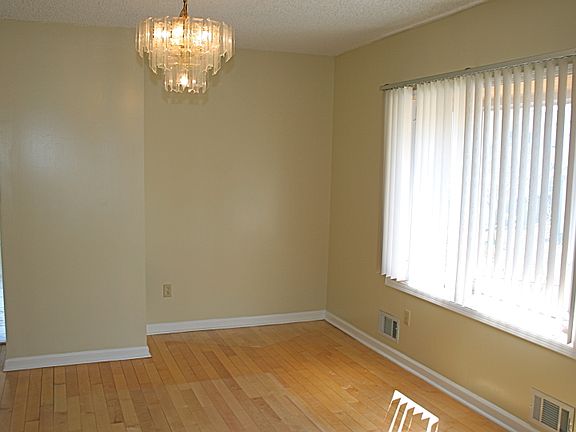 Half Duplex with front porch. Living rm (gas inset fireplace) & dining rm with prefinished wood floor; eat-in kit (gas stove, dishwasher, refrigerator) w/adjoining den/mud rm w/slider to deck. Second floor with 2 bedrooms and a full bath. Basement with recreation room, office, and bathroom w/whirlpool tub, stall shower and laundry hookups. Basement has door access to the backyard. Interior will be painted. Tenant responsible for utilities, lawn maintenance, snow removal and first $100 of repairs. Heat is gas forced air with supplemental electric heat in the kitchen eating area and basement. Owner will replace dining room ceiling fan with chandelier if preferred. Deck table and 4 chairs will remain if tenant wants.