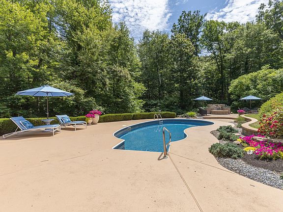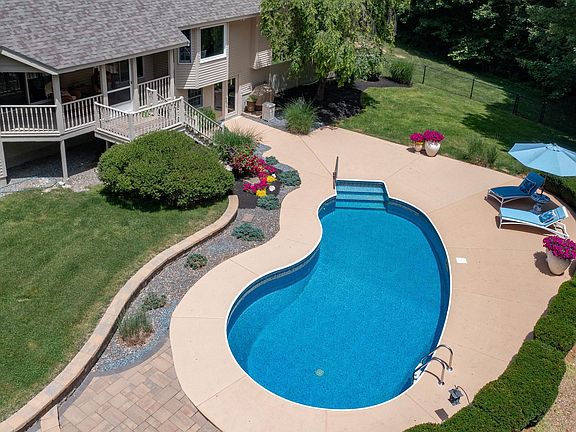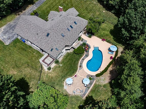 Rarely does such an exquisite property become available. 5 sprawling acres are impressive throughout. Unique and thoughtful design is instantly appealing as you enter this stunning home. Living room open to formal dining room, highlighted by soaring ceilings, palladium and half round windows, skylights filtering plenty of natural light. Kitchen is warm and inviting, neutral granite and stainless appliances. Bump outs with custom windows in sink area and breakfast nook offer picturesque views of the serene outdoor space. Open to family room with 8 foot sliders to expansive cedar covered screen porch. Spiral stairs to 2nd floor bonus room, possible Guest Suite or home office. Primary En Suite with a true spa vibe. 8 foot sliders access the covered porch and deliver pool views. Striking gray cabinetry in updated bath with glass doors to decking with hot tub and privacy fence. 2 additional bedrooms (all with California Closets) and bath complete the main level. Estate like setting with a gorgeous inground pool, masonry firepit, surrounded by woods and lush green landscape. 42X32 detached garage is heated with extra door height, lift, compressor, built in bar and covered porch with ceiling fans. Called "the barn", it's possibilities are endless. Car enthusiast, craftsman, great potential for an array of uses. Central air, irrigation, 5 garages, walk out basement. New in 2022, roof, exterior paint and garage doors. OPEN HOUSE TUESDAY JUNE 28TH and THURSDAY JUNE 30TH, 2PM-4PM.