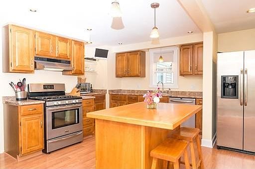 Great opportunity as an investment or owner occupied two family. First floor unit features updated kitchen with center island, stainless steel appliances as well as a remodeled full bathroom. Formal dining room accented with a wood burning stove surrounded by a brick mantel. Hardwood flooring, new fixtures, pantry with washer dryer hook ups and two bedrooms complete this bright and sunny unit. Second floor offers a well maintained spacious 3 bedroom apartment with flexible floor plan. This unit also boasts full bathroom, living room, eat in kitchen and washer dryer hook ups. Recent building updates and improvements include, vinyl siding, roof, on demand hot water, 200 amp electrical panel, new heating system and all new energy star certified LED lighting. Professionally landscaped yard with plenty of off street parking and storage shed.