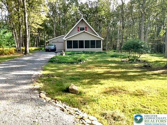 Spend all four seasons in the POCONOS in this well-maintained mountain CHALET home! Home layout features one bedroom, full bathroom and laundry on the first floor which is super convenient. Second floor offers two spacious bedrooms and a half bath which is perfect for guests. This charming home features living room with wood beams, a free-standing propane stove, hardwood floors, a cozy dining area, and galley-style kitchen complete with all appliances. Additional conveniences include a laundry room with extra shower and a screened-in front porch perfect for relaxing and observing nature. Home boasts of an oversized attached garage with a dedicated work area and could potentially be converted to a game room. Ideal LOCATION...walking distance to MULTIPLE amenities in Bear Creek Lakes such as the pool, south beach, tennis, basketball, bocce ball, horseshoe pits, pickleball courts, clubhouse, walking trails and playground. North beach & boat dock are only a short golf cart ride away. Minutes to Historical downtown of Jim Thorpe, hiking, biking, rafting, skiing and major Pocono attractions. Call today!