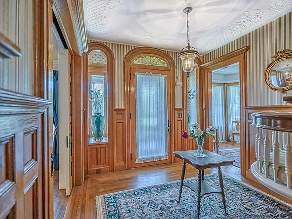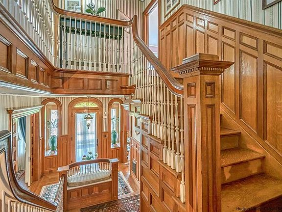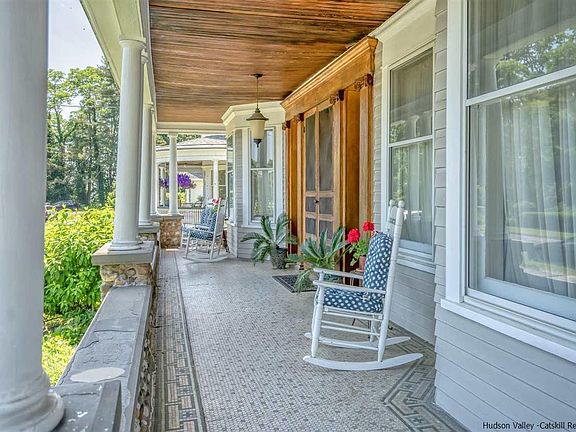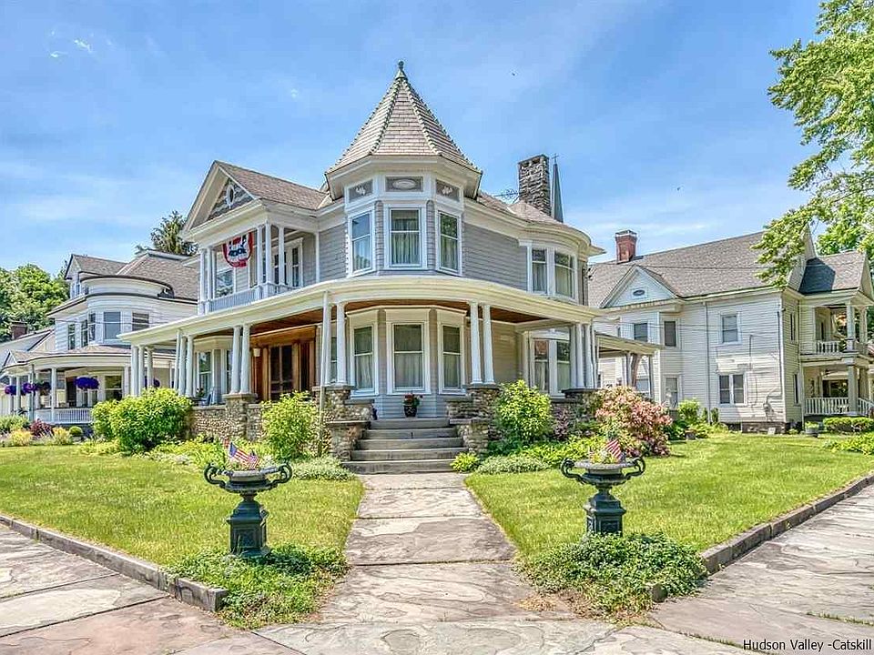 Lovely Queen Anne Victorian positioned at 20 Presidents Place in the Rondout section of Kingston, NY. The approach is a tree lined street with unique and interesting homes dotted along the Presidents Place circle. The turret, front tiled veranda, side porch and second floor balcony flanked by decorative columns, and river rock invite you to the front door. Beautiful 2 inch thick Oak doors are just the starter for the amazing foyer and the lavish use of Oak with raised Paneled walls in the foyer, staircase, and dining room, take you back to the craftsmanship of the past. This 3,270 sq. ft, 4 BR, 1.5 Baths home has hardwood flooring throughout, 9.6 foot ceilings on both the first floor and second, each room is ample sized, 2 ornamental fireplaces. Living room is a grand size 30 x13.10 with lots of windows and built-ins. The dining room, foyer and upstairs landing ceilings has raised motif plaster design, and of course the raised paneled walls. Kitchen features modern conveniences and appliances. Den is tucked away in the back of the home with a wonderful wrap-around porch. Upstairs 4 bedrooms, office and balcony. Spacious Full Bath. Third floor has bonus room for yoga or art studio, plenty of storage! Come over and have a look, you won't want to leave. Back and side gardens are completely fenced in. Also included in sale a 1 car garage and view protected lot. Additional details- Custom Cherry Cabinets ,Front and Back staircases, Stained glass windows, Butler's door, Picture rails, Handsome molding throughout, Oak paneled doors throughout, Pocket doors, Granite countertops, Central Air, Huge full basement, wine cave, root cellar, alarm system, the list goes on and on! Please note this property is 2 lots totaling .34 acre- 1 lot with the house, the other across Presidents place with the garage and the view of the City, Rondout Creek and Hudson River in the distance.