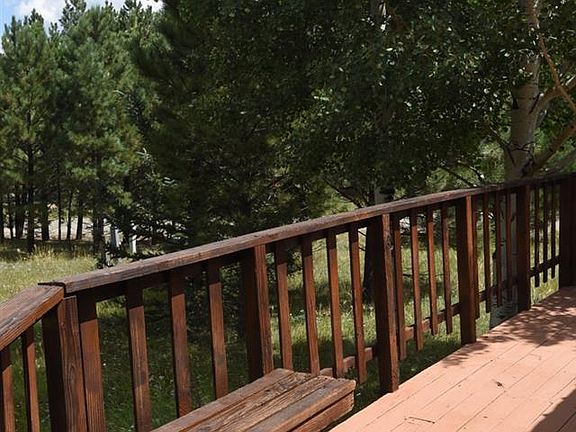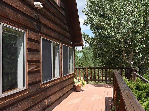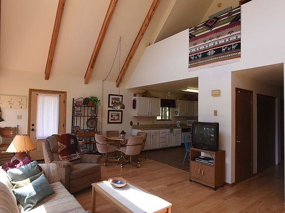 A big little house in a great location. Ideal for someone wanting to spend time enjoying the great outdoors and not buried in property maintenance. Built by Carlisle Construction in 1986, space is light-filled, interesting and well-planned. Chalet-style home with vaulted ceilings, wood floors, and efficient wood burning stove in LVRM. 2 bedrooms and roomy eat-in kitchen with electric range, microwave, dishwasher and refrigerator on first floor. Full-size washer and dryer. Stairs lead up to small loft that, with a small sofa bed, could be used for extra sleeping space. Large Master BDRM, with walk-in closet, on second floor accommodates a king bed with night stands, and still has plenty of room for a trundle bed, seating area and computer desk. Hallway has wood floors. Both bathrooms have granite vanity tops and lower BA has radiant in-floor heat. Sleeps 11. Forced-air heat, along with wood burning stove and solar gain from Chalet windows help reduce heating bills. 576 +/- sqft of decks for your BBQ and outdoor seating. House surrounded by lovely, healthy conifers and wildflowers. Distant mountain views from front of house. Flat, easily accessible driveway off a paved road. On town water and sewer. Close to the Village of Angel Fire, Angel Fire Resort ski mountain, Country Club, PGA-rated golf course and Monte Verde Lake.