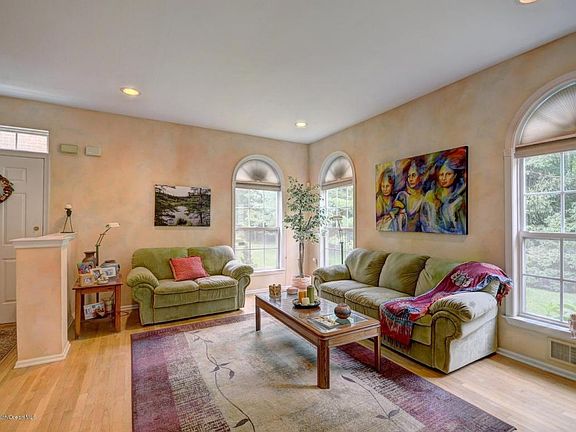 Lovely Bristol model offers desirable open floor plan! Gorgeous hardwood floors in spacious LR, DR & family room, recessed lighting, Palladian windows. Kitchen includes full appliance package and breakfast area, with a two-sided fireplace to also warm the family rm. A patio door leads to deck overlooking a professionally landscaped, private yard, backing to woods. Master retreat offers walk-in closet, bathroom w/twin sinks, huge walk-in shower, soaking tub, and vaulted ceilings! So Many Closets! Convenient 2nd fl. laundry, full finished basement w/2nd family rm, office, and more closets! More storage in garage attic! Enjoy the deck perfect home for your changing needs! A+ School District! Convenient to NYC Bus and shopping!
