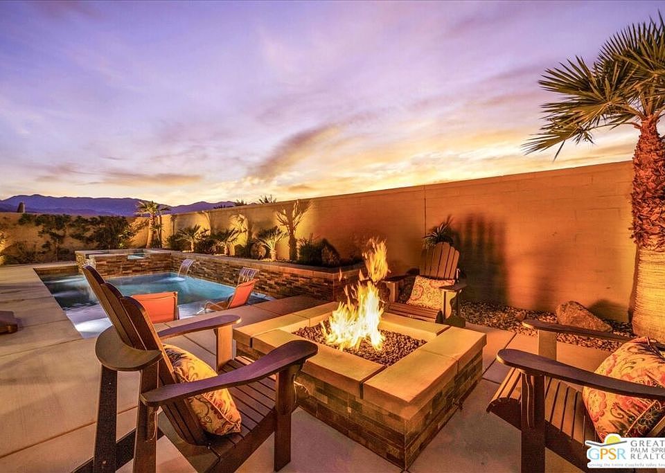 Stylish Prairie-Style Retreat with Mountain Views & Luxe Outdoor Living. Nestled in the desirable PHASE 5 of Del Webb Rancho Mirage, this stunning PLAN 6 - PRESERVE floorplan offers the perfect blend of elegance and comfort in a premier 55+ community. Boasting OWNED SOLAR, breathtaking mountain views, and a private saltwater POOL & SPA, this home is designed for effortless indoor-outdoor living. Step inside to discover a bright and airy open-concept layout with durable wood-look tile flooring and custom window treatments throughout. The gourmet kitchen is a chef's dream, featuring a walk-in pantry, professional-grade KitchenAid stainless steel appliances, a custom tile backsplash, and an expansive executive island with granite countertops, ample storage, and stylish pendant lighting. The primary suite is a serene retreat with pool and mountain views, a spa-like ensuite with dual vanities, an oversized stall shower, and a generous walk-in closet. A well-appointed guest wing includes access to an upgraded bath with a glass-enclosed shower and modern nickel hardware and fixtures. The versatile den/office with French doors offers the flexibility to suit your lifestyle. Designed for year-round enjoyment, the fully landscaped backyard features an expanded covered patio with motorized zipper shades, a gas firepit, and ambient lightingperfect for evening gatherings. The saltwater pool and spa with a tanning shelf create a resort-like atmosphere right at home. Experience the vibrant Del Webb lifestyle with exclusive access to the clubhouse, fitness center, resort-style pool & spa, tennis courts, pickleball, and more. Come see why this is the perfect place to call home! *Murphy beds in den and guest room are included.