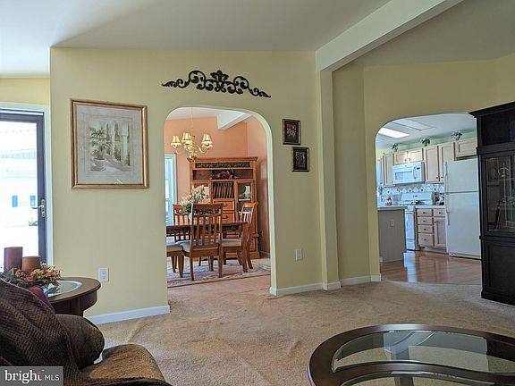 This popular Saratoga model home nestled on a quiet lane features a generous kitchen with light oak cabinets, center island for plenty of storage and counter space and cozy breakfast nook with sliders to the airy front porch. Spacious living room plus formal dining room or den with vaulted ceilings and pretty curved archways throughout. Two comfortable bedrooms and two full baths plus handy laundry/mud room off the oversized one car garage. The primary bedroom offers a huge walk-in closet and adjoins the luxurious on-suite bath with jetted soaking tub, double sinks, vanity area and walk-in shower. Barclay Farms is Kent County's premier 55+ active lifestyle community. Community amenities include: pool, clubhouse, fitness center, spa, library, game rooms with billiards table, walking paths, catch & release fishing pond, fitness classes , various clubs & other activities to enjoy. Land lease $537.93 per month includes all community amenities, lawn maintenance, trash removal, road maintenance & snow plowing. Quiet setting conveniently located in Camden Delaware with easy access to shopping, restaurants, healthcare, and the Delaware beaches.