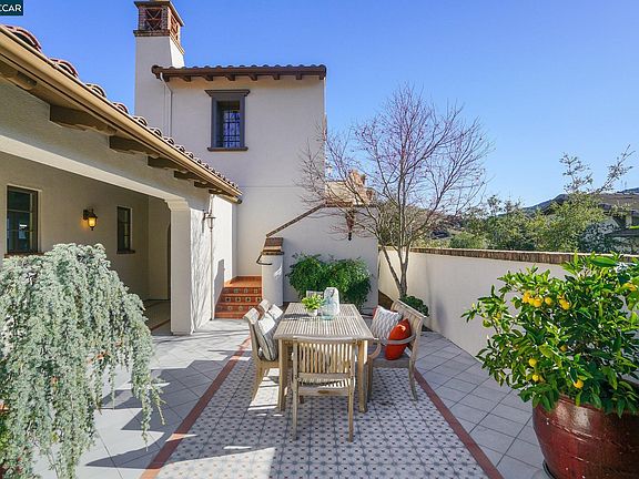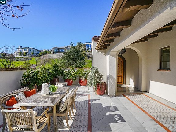 Captivating Spanish style home built in 2014 with 5 Bedrooms, 4.5 Baths, office, 4,096 sq ft with custom updates throughout. Private courtyard with striking custom tile, gas fireplace, and multiple entertainment spaces. Open concept floor plan with an impressive great room framed by vaulted ceilings & rustic timber beams, fireplace, with double doors leading to the balcony looking towards Mt Diablo and the expansive hillside and on the interior side leading to the cozy courtyard. New quartzite countertops with gorgeous marble backsplash, center island, Thermador appliances, a separate caterer’s pantry, perfect for entertaining. Charming archways, old-world drywall finish, and hardwood floors throughout the living spaces and a professionally landscaped yard. On the main level is the luxurious primary suite with two walk-in closets, dual vanities, soaking tub, a secondary ensuite, laundry room, guest bath and 2 garages. A separate, serene office with its own gas fireplace. Downstairs there are 3 bedrooms, 2 baths, a wine room and a large entertainment room that opens to a back patio with awning, outdoor speakers, & a spa. Two Tesla Powerwalls, a Juice Box charger and owned SunPower solar energy system.